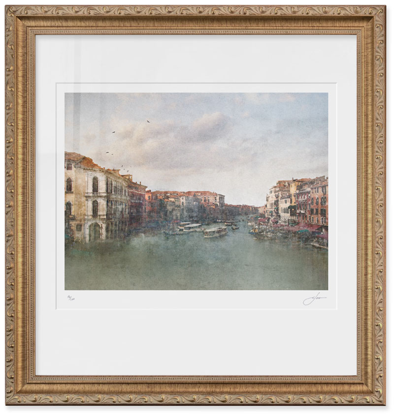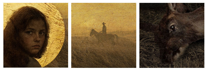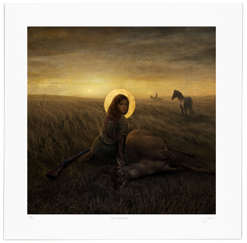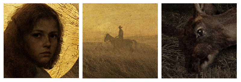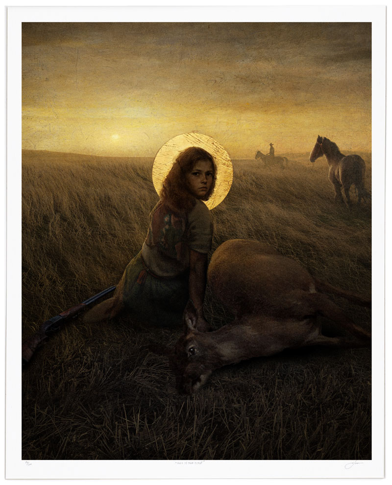 The gilded halo around the girl’s head elevates the art to an almost religious quality. All the while, the vast field that surrounds brings about a sense of isolation and introspection.