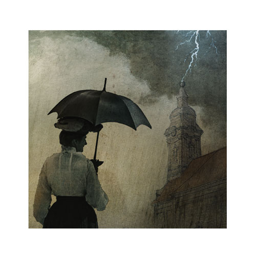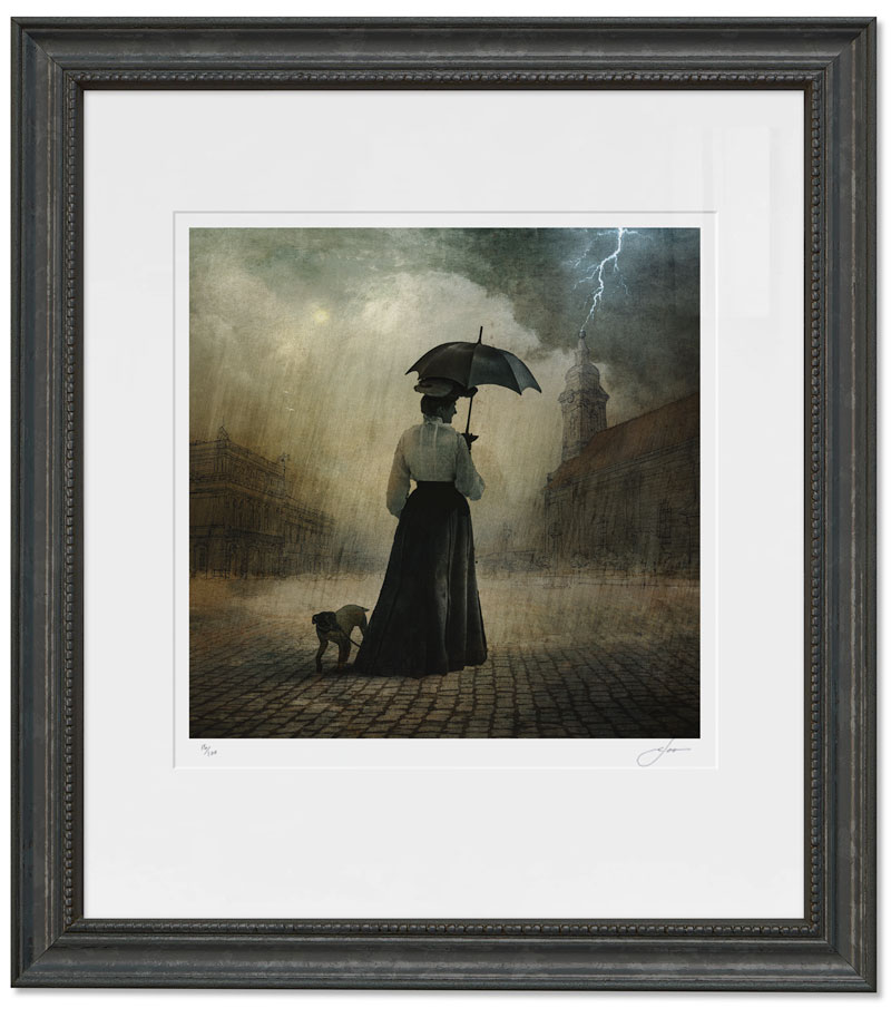 The small dog adds a poignant touch. Its vulnerability could represent the more fragile parts of the self that follow us through hardship. She protects herself with the umbrella, but the dog has no such shelter.