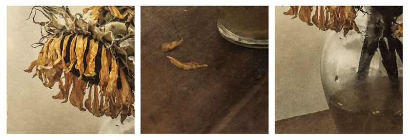 The flowers are past their vitality, yet they are not discarded. They sit in the glass vase with dignity, to finish becoming what time intends.