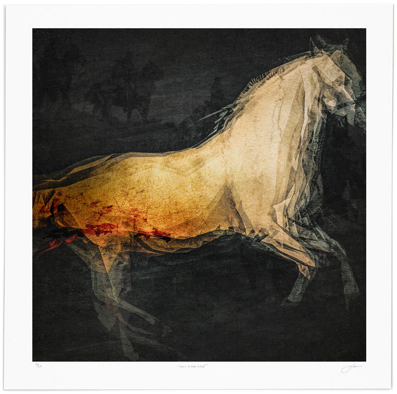 The horse floats inside cubist fragmentation, shattered across a state between life, injury, and memory. Earthy tones, bone whites, and soot blacks, punctuate the blood stains, tactfully abstracted into texture, leaning the piece away from graphic sensationalism.