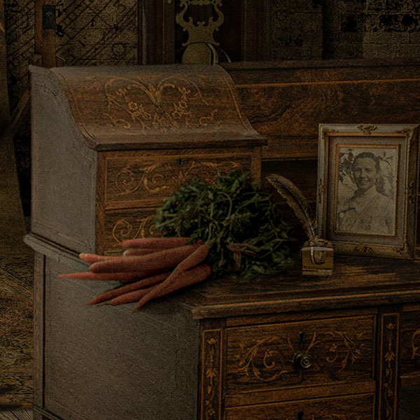 One small, pivotal detail transforms the scene: a framed photo of a woman perched on the wooden desk beside the carrots. The portrait feels intimate, like a memorial. It’s not part of any painted fantasy; it’s a real-world artifact, inside the studio, suggesting a personal connection.