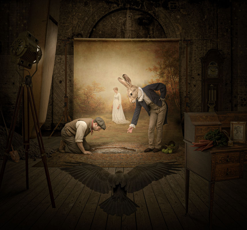 The studio setting is a space of creation and illusion, where the painted backdrop represents the illusion and the hole represents the creation of opportunity in this realm.