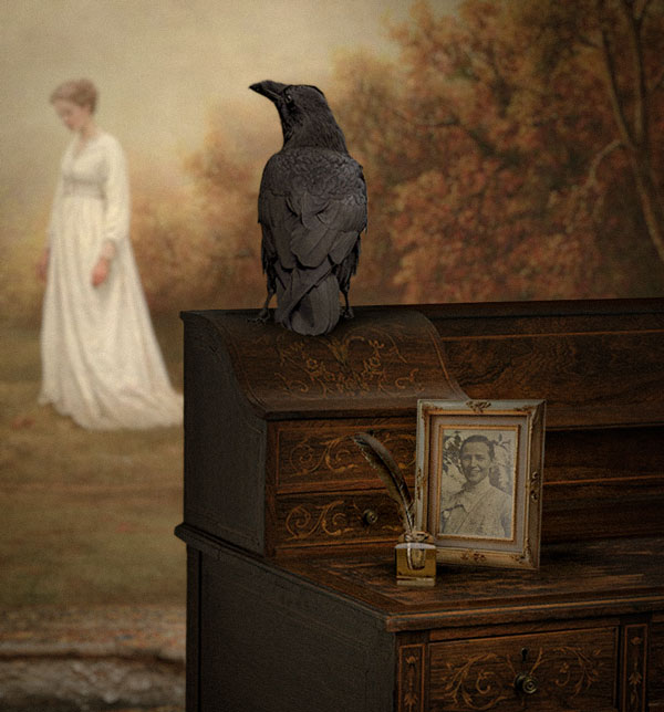 With the Raven swooping into the scene, it could be showing the way to the afterlife. Here, the Raven becomes the intermediary: not a whimsical Wonderland creature, but a sombre escort for souls. Its placement along the same foreground plane as the desk, quill, and photo reinforces this.