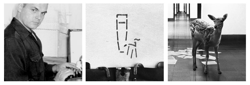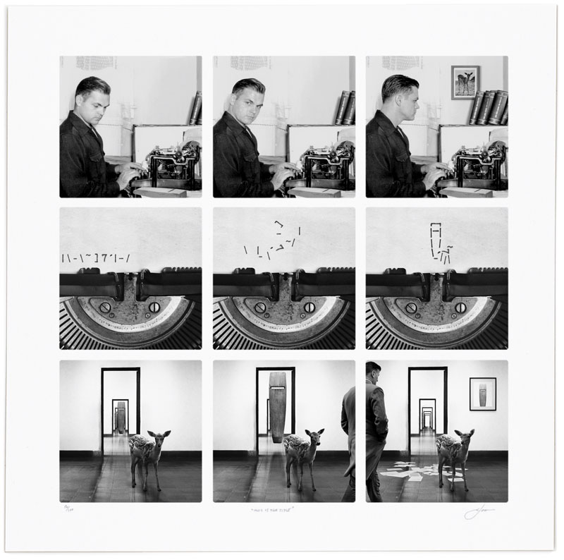 The grid insists on fragmentation, sequence, and progression. The division of space and time. Yet in the final row, the walking man crosses two panels at once. A disruption in the orderliness that the deer reveals is an illusion.