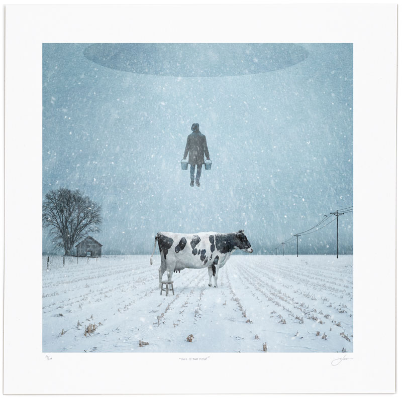 It is absurd… but refuses to acknowledge its absurdity. It does this through a quiet confidence, one that keeps you looking. I like how the cow acts as visual ballast; its indifference grounds the scene and delivers the joke silently. I also like the careful composition and restrained palette. It gives a unique mood and a quiet tension.